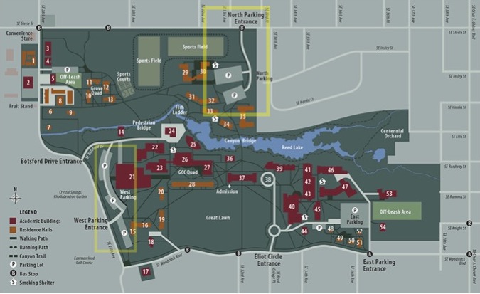 Those needing ADA access, are advised to park in the West Lot, located immediately adjacent to Reed College’s Performing Arts Building and Kaul Auditorium. There are 6 ADA parking spaces in the West Lot. From the parking lot, enter the main entrance of the Performing Arts Building. Take the elevator to the 3rd floor, and use the bridge at the east end of the building (“East Bridge”) to exit towards the picnic lawn and Kaul. Be aware that this distance is 700-800 feet.